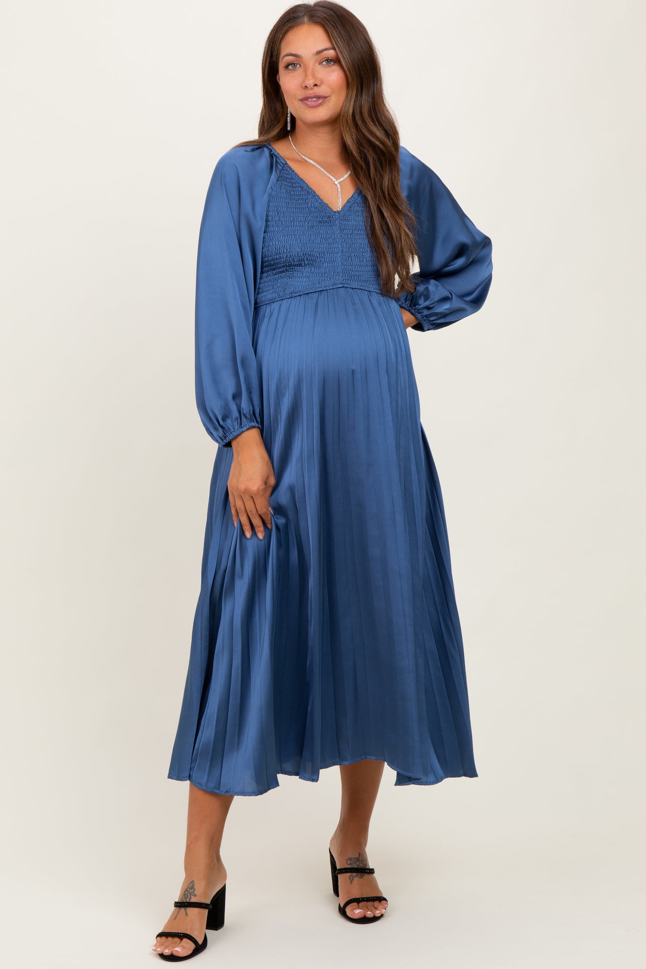 Blue Satin Smocked Pleated Maternity Midi Dress