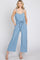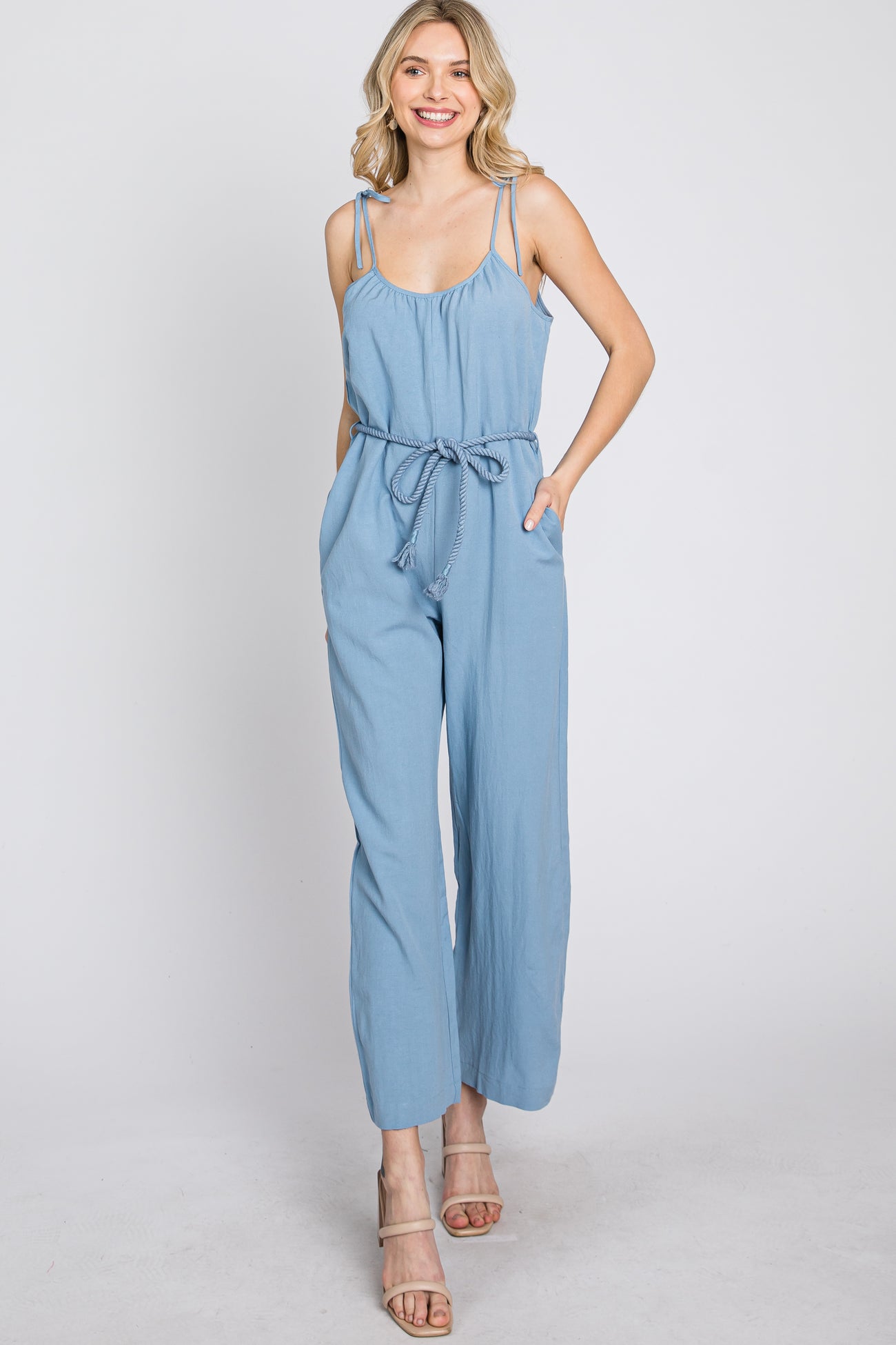 A linen jumpsuit with a scoop neckline, adjustable shoulder ties, side pockets, and a rope waist tie.