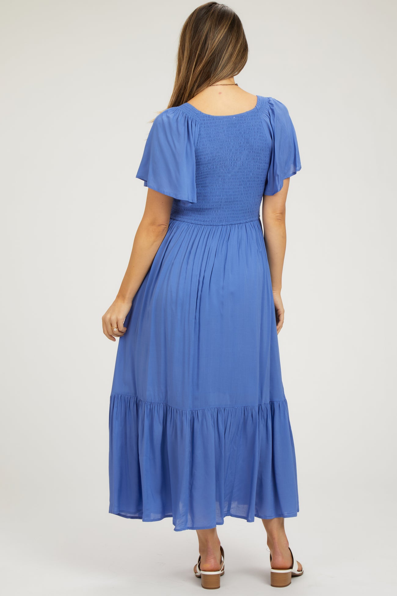 Blue Smocked Flutter Sleeve Maternity Midi Dress