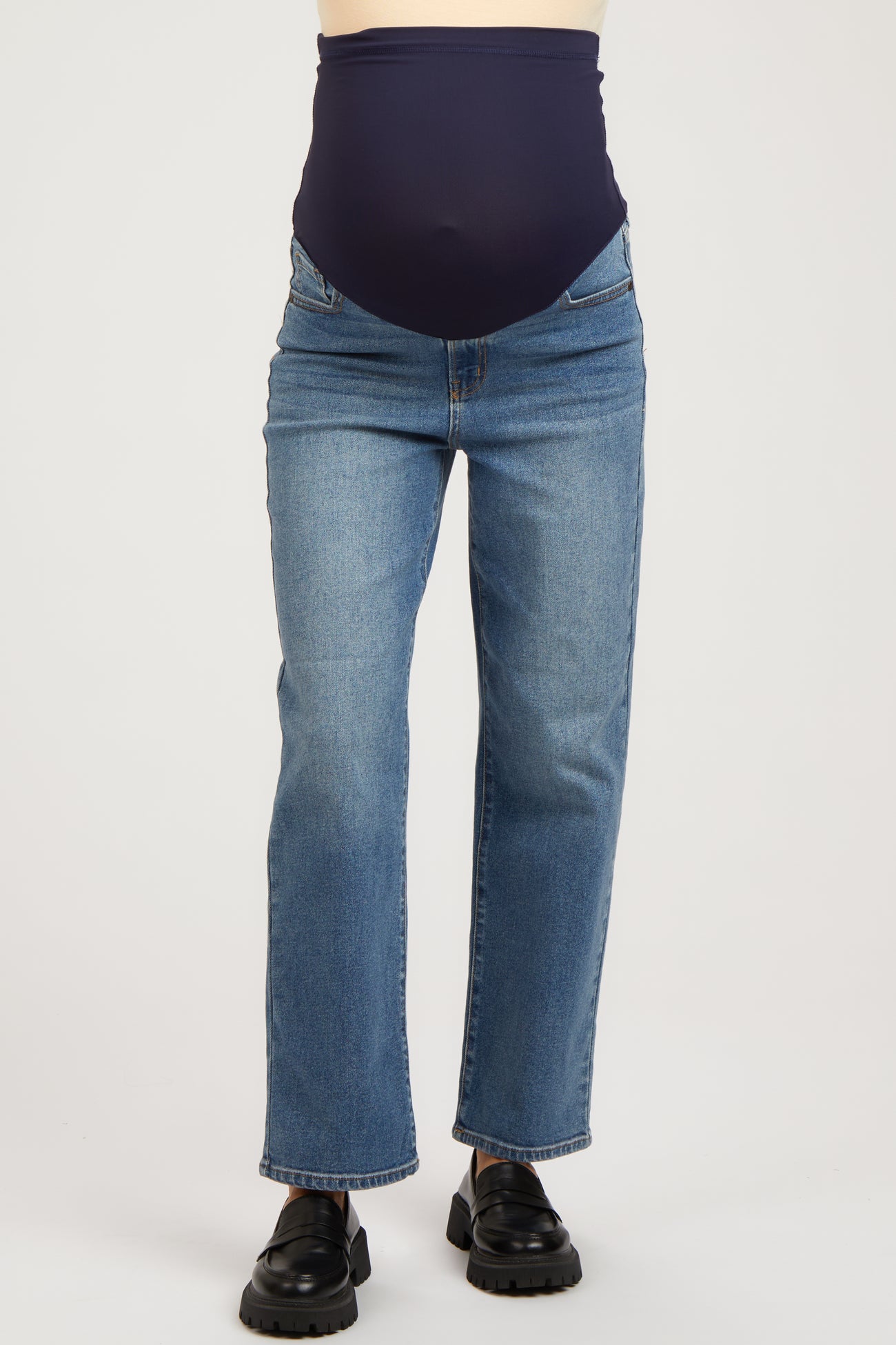A pair of maternity jeans featuring 5 pockets, a straight fit, crop length and an elastic belly band.