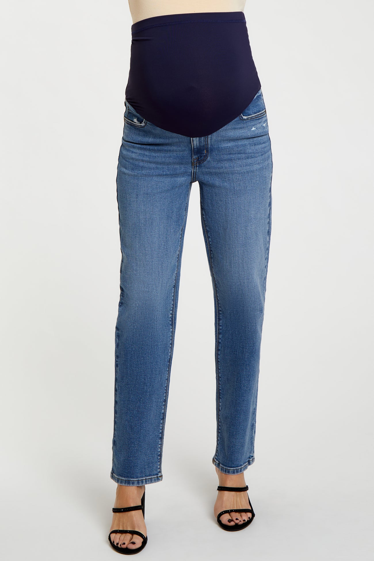 A pair of medium wash maternity jeans featuring five pockets, a straight hem and an elastic belly band.