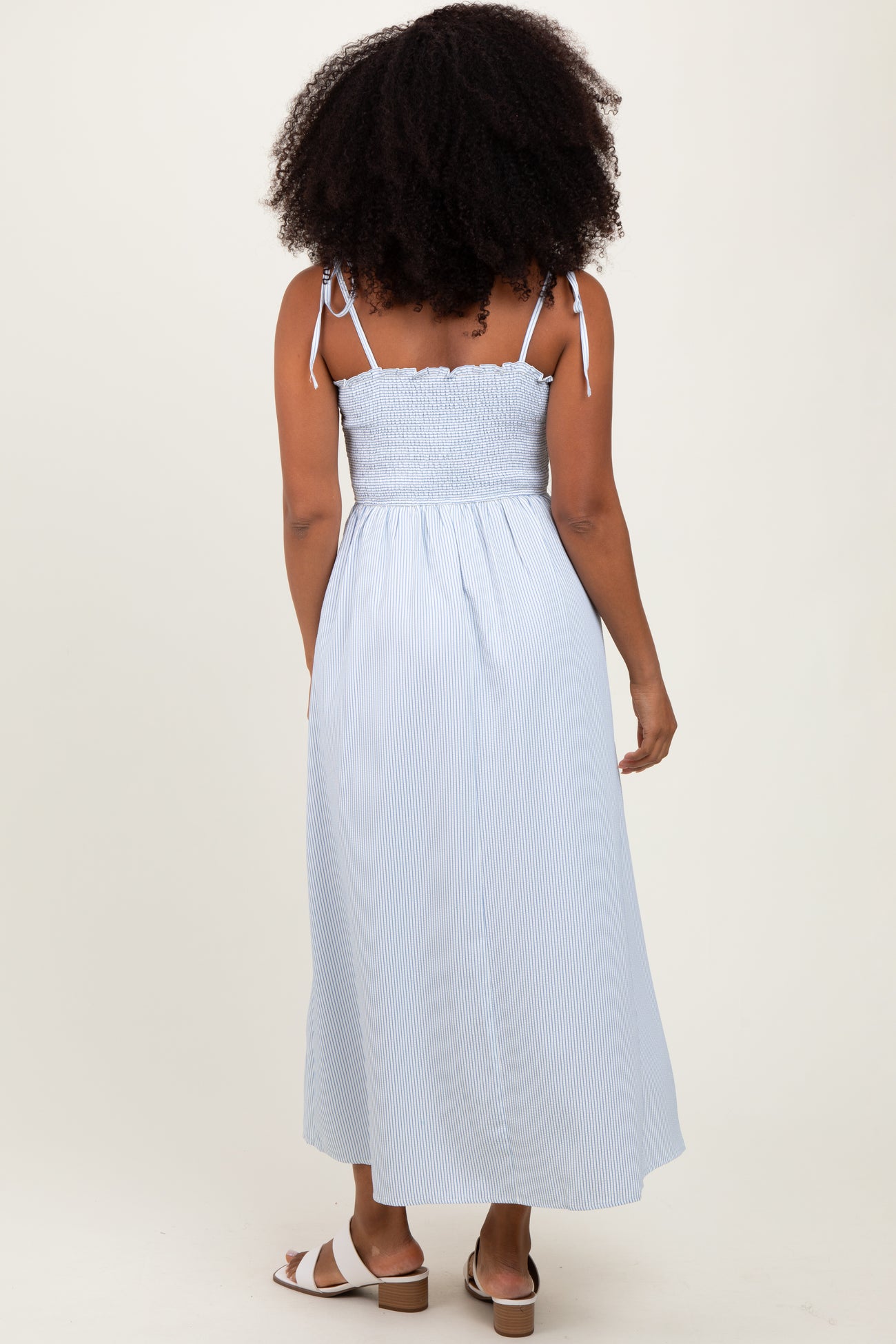 Blue Striped Shoulder Tie Smocked Maxi Dress