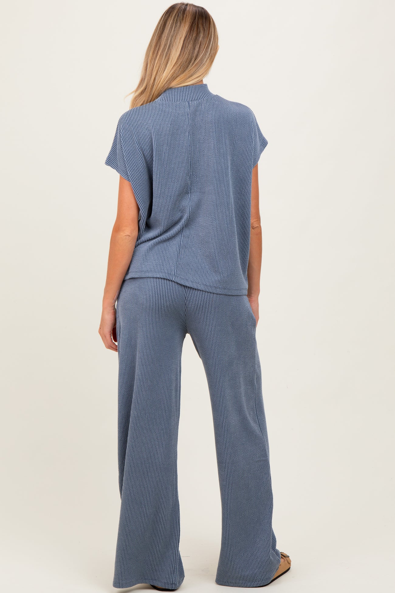 Blue Textured Rib Mock Neck Short Sleeve Pant Maternity Set