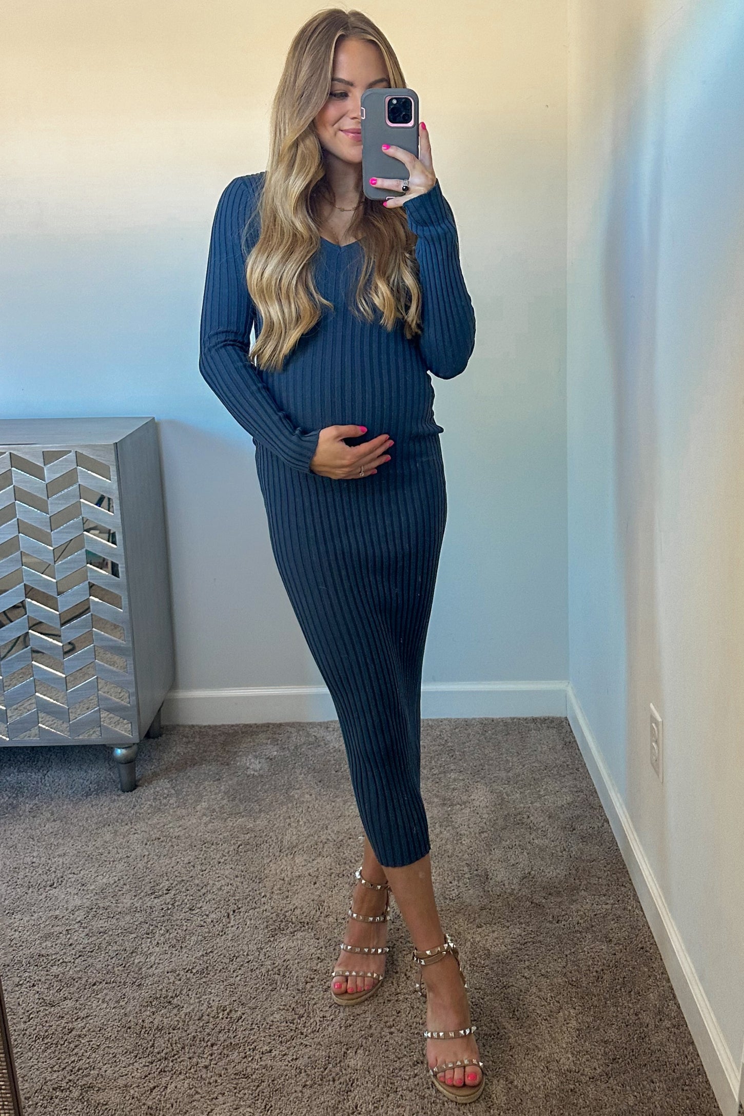 Elevate your maternity wardrobe with our Blue V-Neck Long Sleeve Fitted Maxi Dress. Designed for comfort and style, this dress features a flattering V-neckline, long sleeves, and a beautifully fitted silhouette that highlights your growing bump. The soft, stretchy fabric provides all-day comfort and flexibility, perfect for special occasions or everyday elegance. The rich blue hue adds a pop of color to your look, while the maxi length ensures a graceful and chic finish. Effortlessly transition from day to night with this versatile maternity must-have!