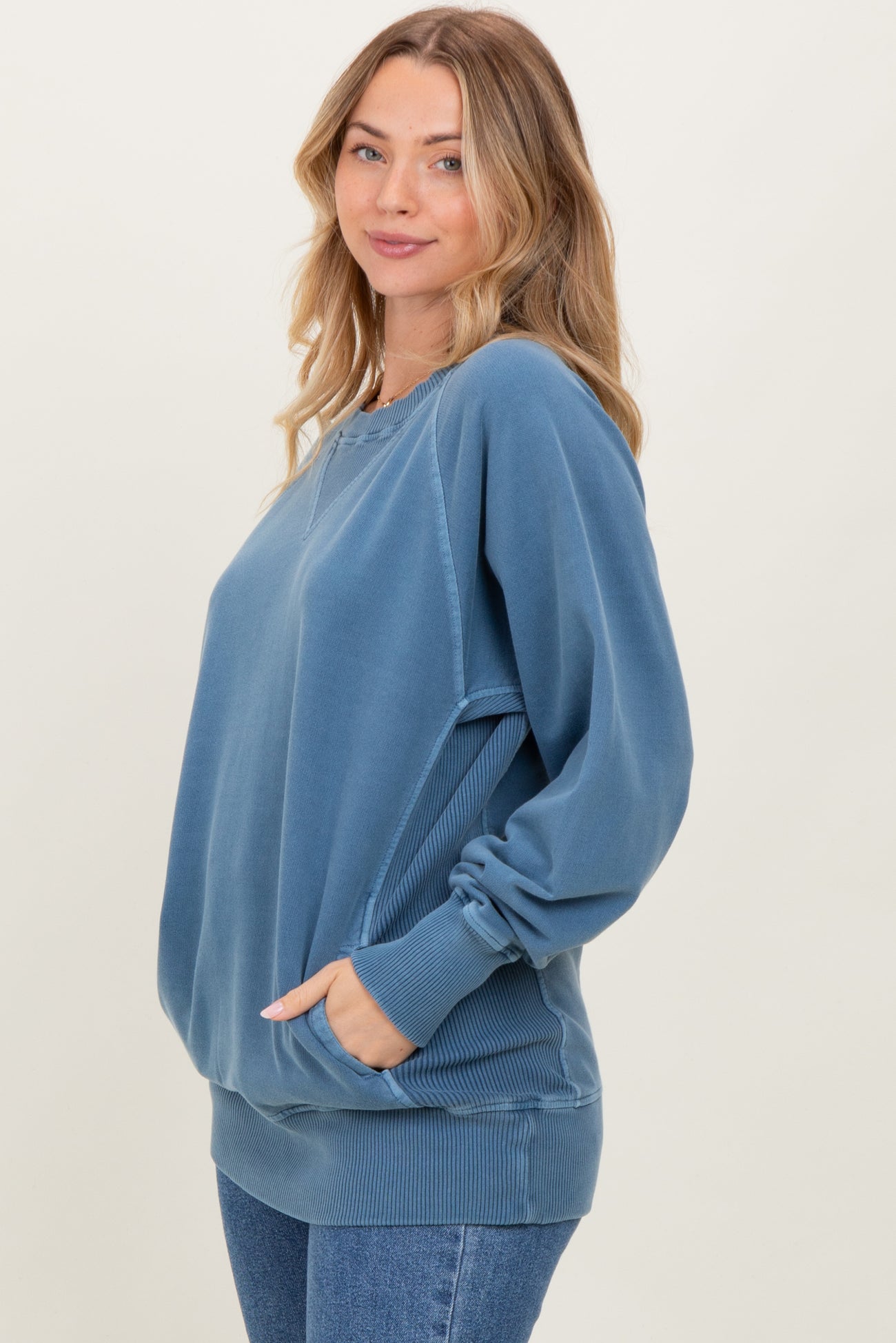 Embrace cozy comfort with our Blue Vintage Wash French Terry Pullover. Crafted from soft French terry fabric, this pullover features a relaxed fit that drapes effortlessly for all-day ease. The vintage wash adds a stylish, worn-in look, perfect for casual outings or lounging at home. Designed with ribbed cuffs, hem, and a subtle V-notch detail at the neckline, it adds timeless charm to your wardrobe. Convenient front pockets keep your essentials close while enhancing its laid-back vibe. Pair it with jeans or leggings for an effortlessly chic, everyday outfit. Your new go-to comfort staple!