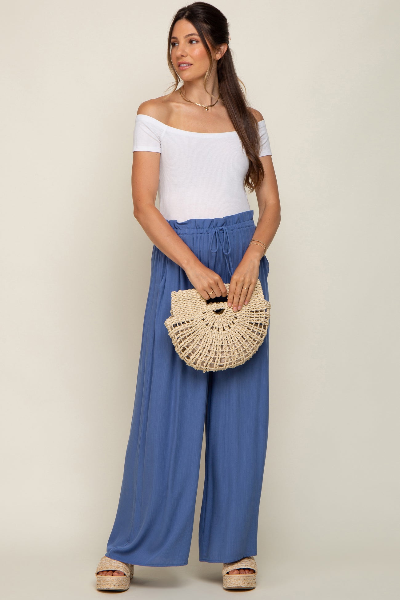 A pair of solid hued maternity pants featuring wide legs, side pockets and a drawstring ruffle waistband.