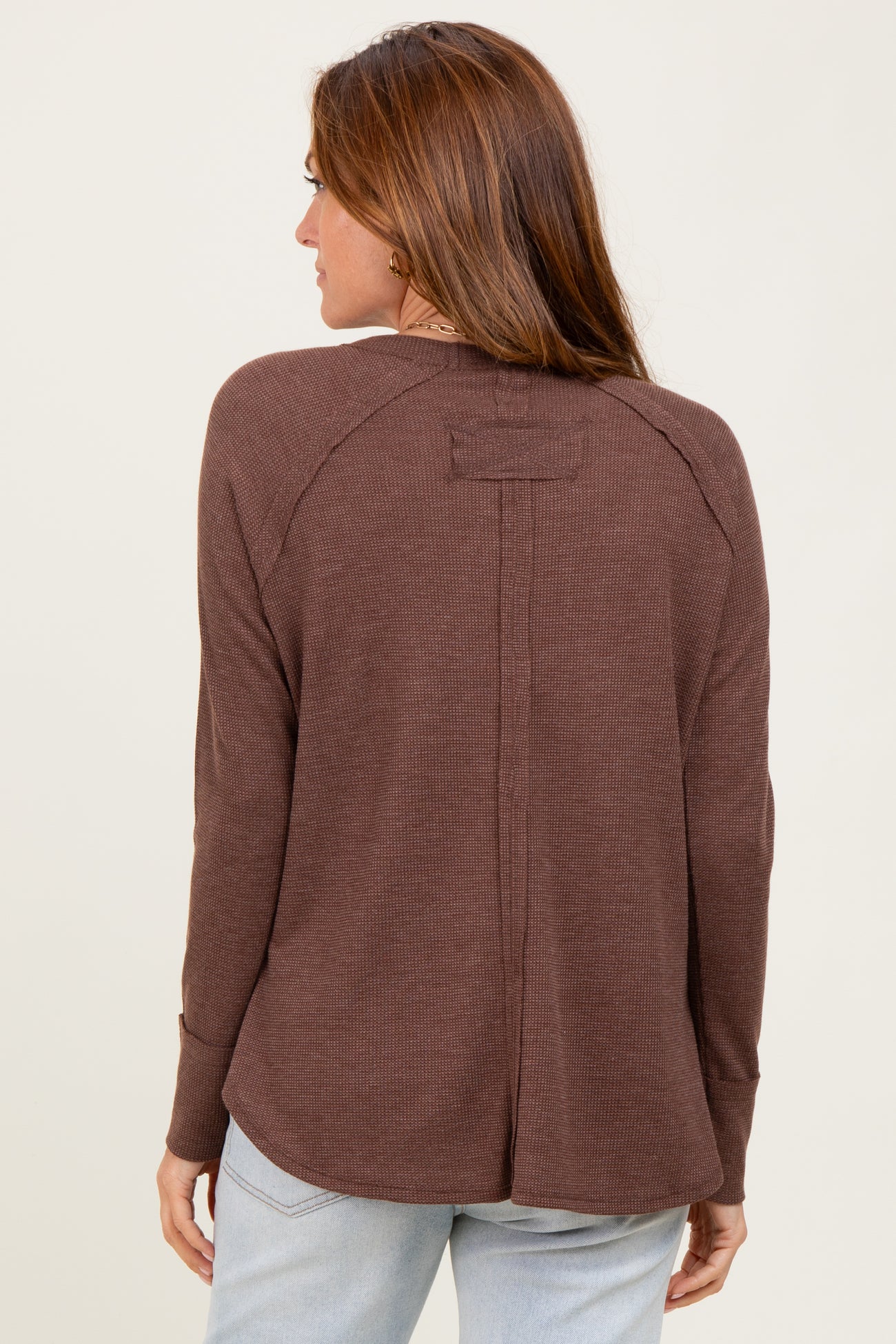 Cozy and chic, our Brown Baby Waffle Knit Long Sleeve Top is a wardrobe essential. Crafted from soft, textured waffle knit fabric, this top offers warmth and comfort for cooler days. Featuring a relaxed fit with a classic crew neckline and subtle side slits, it pairs perfectly with your favorite jeans or leggings. The rich brown hue adds a touch of earthy elegance, ideal for casual outings or laid-back weekends. Lightweight yet snug, it's designed to keep you comfortable without compromising style. Easy to layer and effortless to wear, this top will quickly become your go-to favorite for everyday wear.