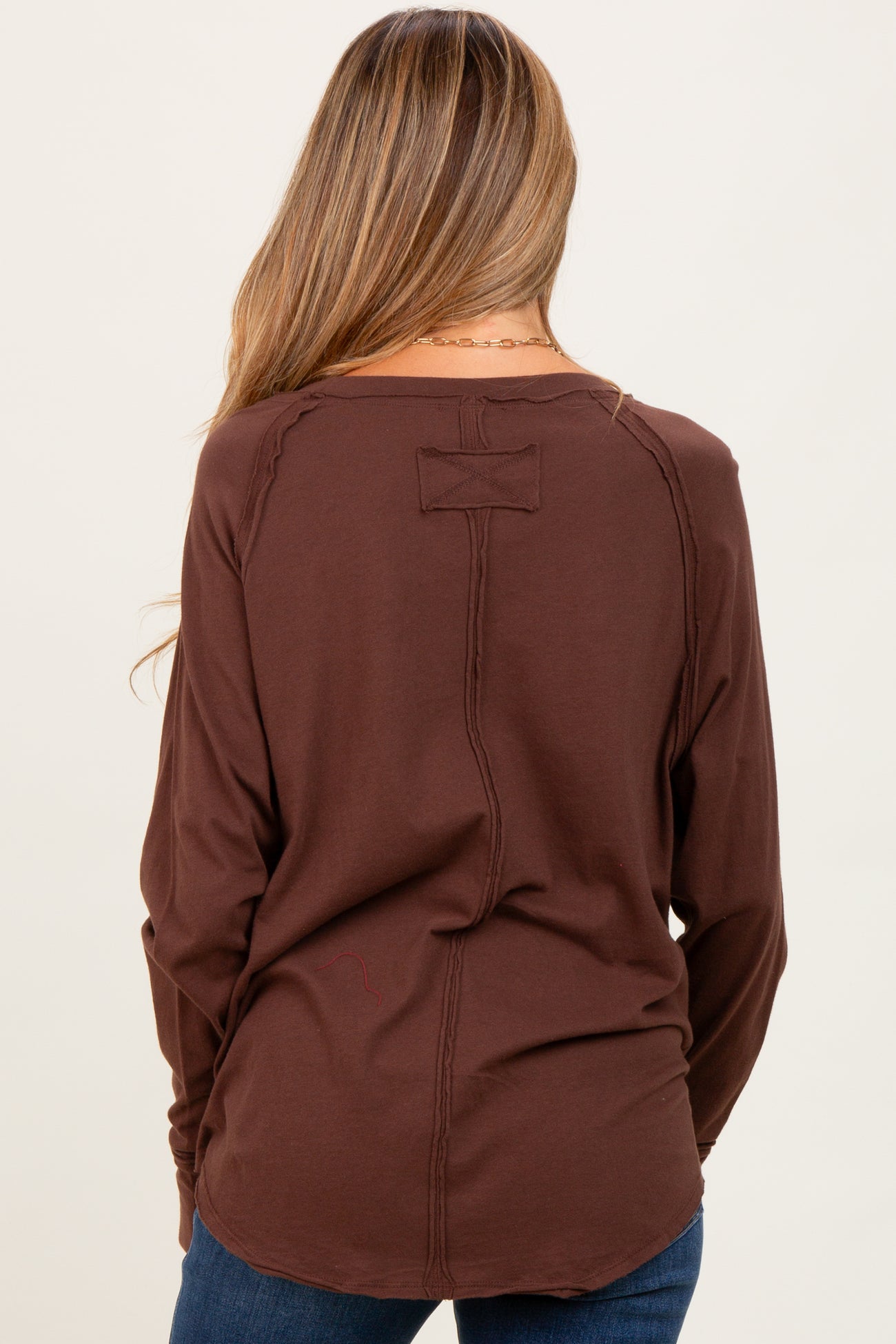 Stay stylish and comfortable throughout your pregnancy with our Brown Exposed Seam Long Sleeve Maternity Top. Crafted from soft, breathable fabric, this top features exposed seam detailing that adds a trendy, modern touch. The relaxed fit and long sleeves provide gentle coverage, while the stretchy material accommodates your growing bump with ease. Perfect for casual outings or layering, this versatile top pairs beautifully with jeans or leggings. Embrace effortless maternity style with a piece designed for both comfort and flair. Machine washable for easy care. Available in multiple sizes to support you every step of the way.