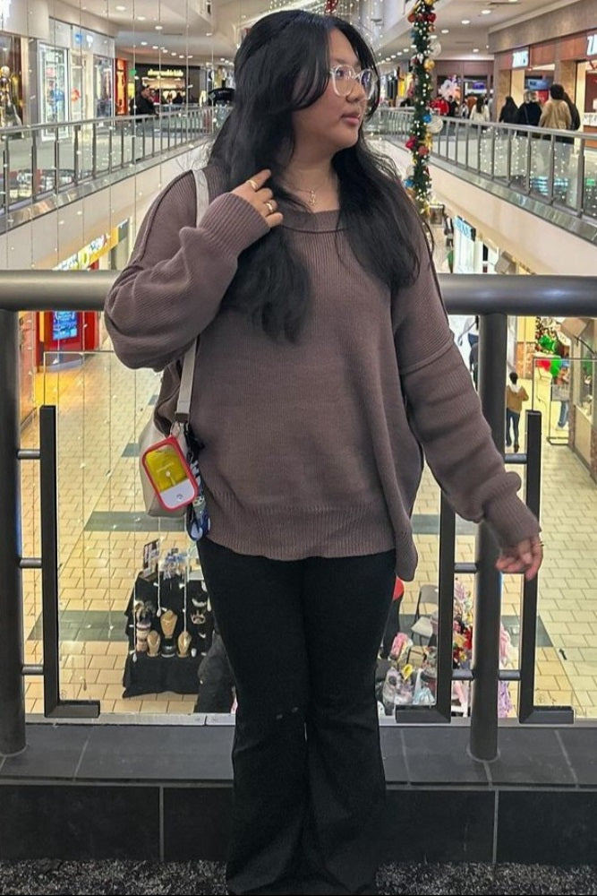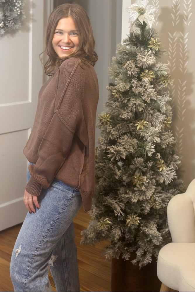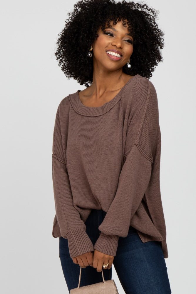 A sweater featuring a crew neckline, ribbed trim, exposed seam detailing, long sleeves and side slits.