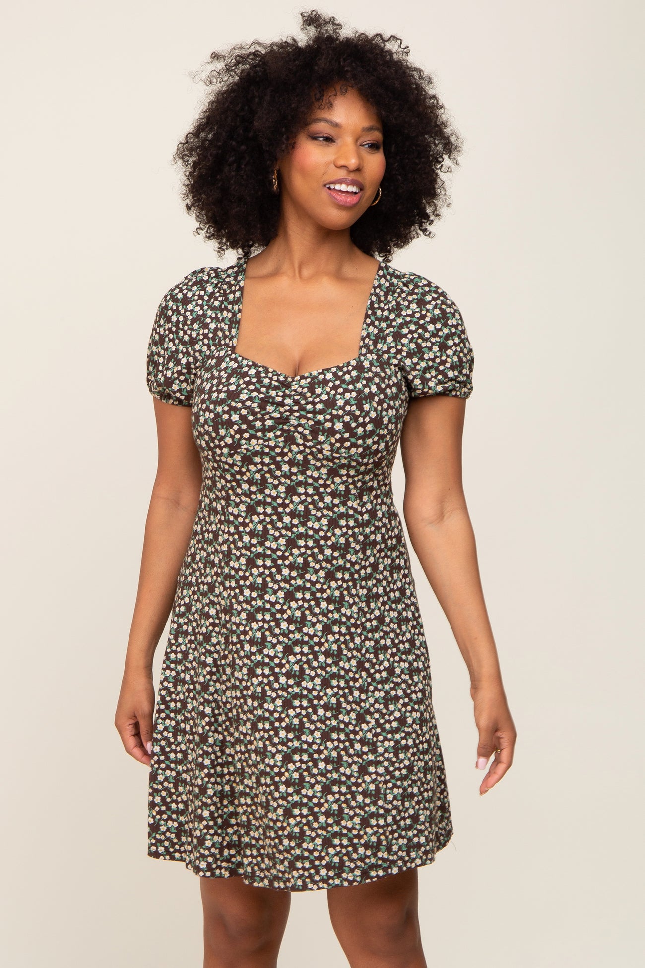 A floral print dress featuring a squared neckline, a front cinched bust, short sleeves, an a-line skirt, and a back criss-cross closure.