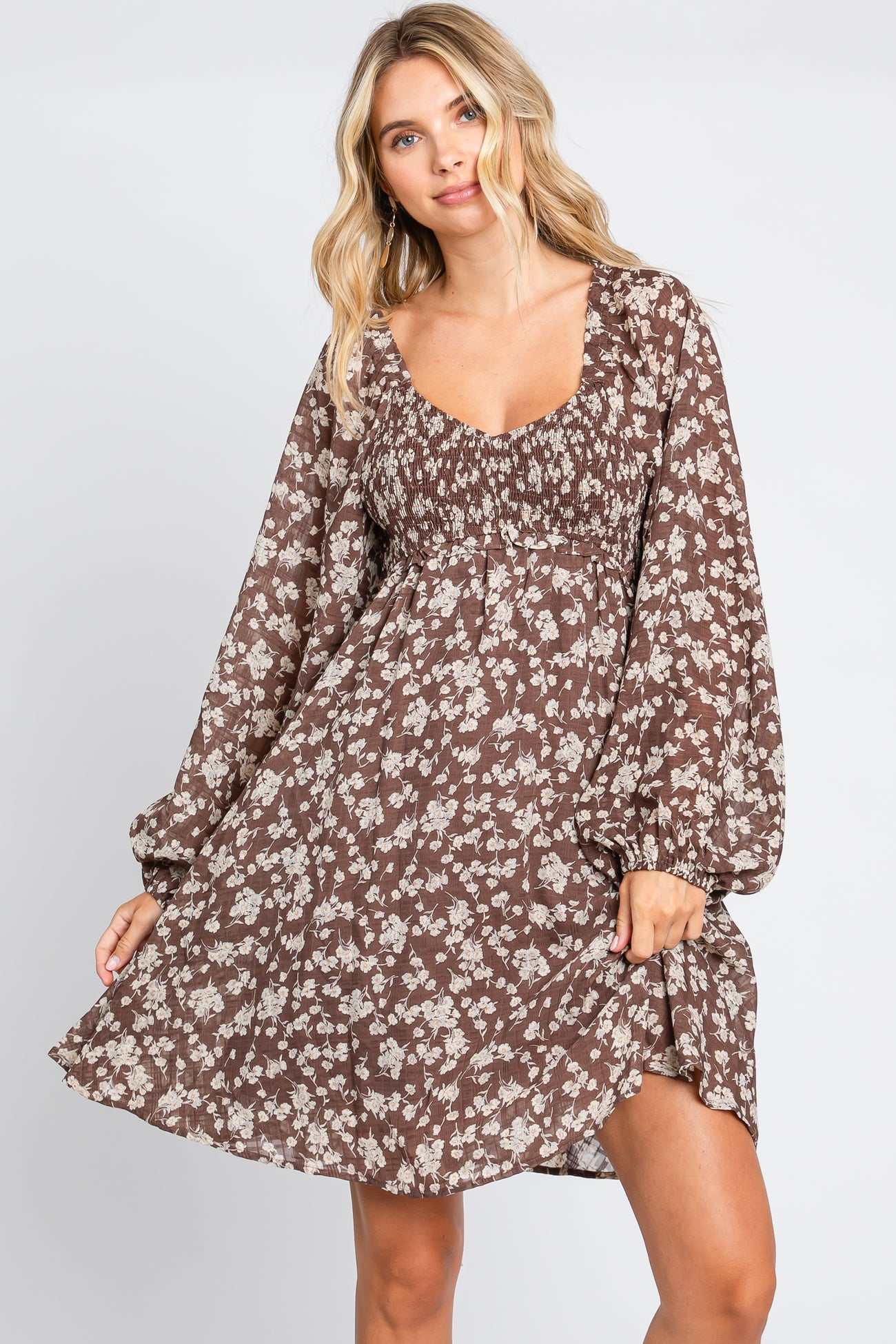 A floral dress that features a v-neckline, a smocked top, long puff sleeves, and a ruffle accent under the bust.