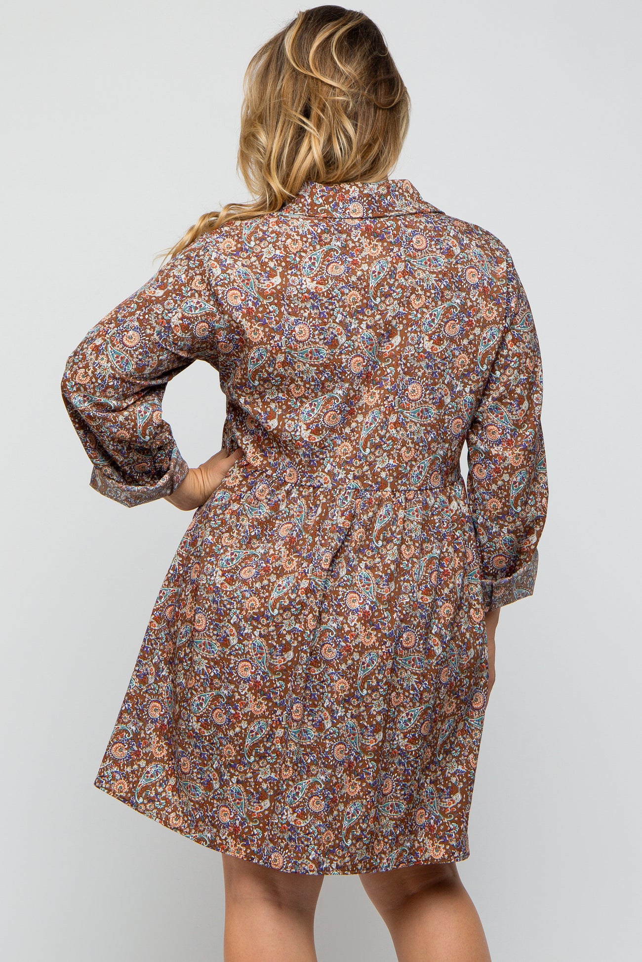 Brown Floral Paisley Button Up Maternity Plus Dress