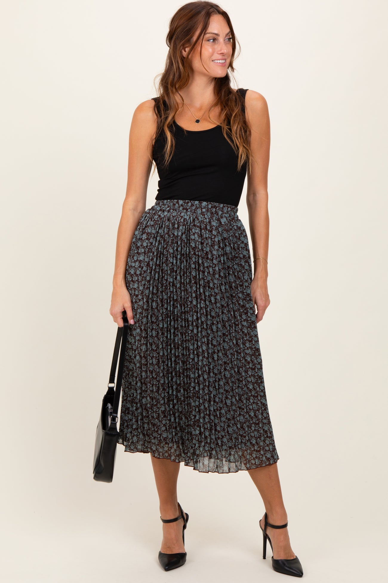 Brown Floral Print Chiffon Pleated Maternity Midi Skirt