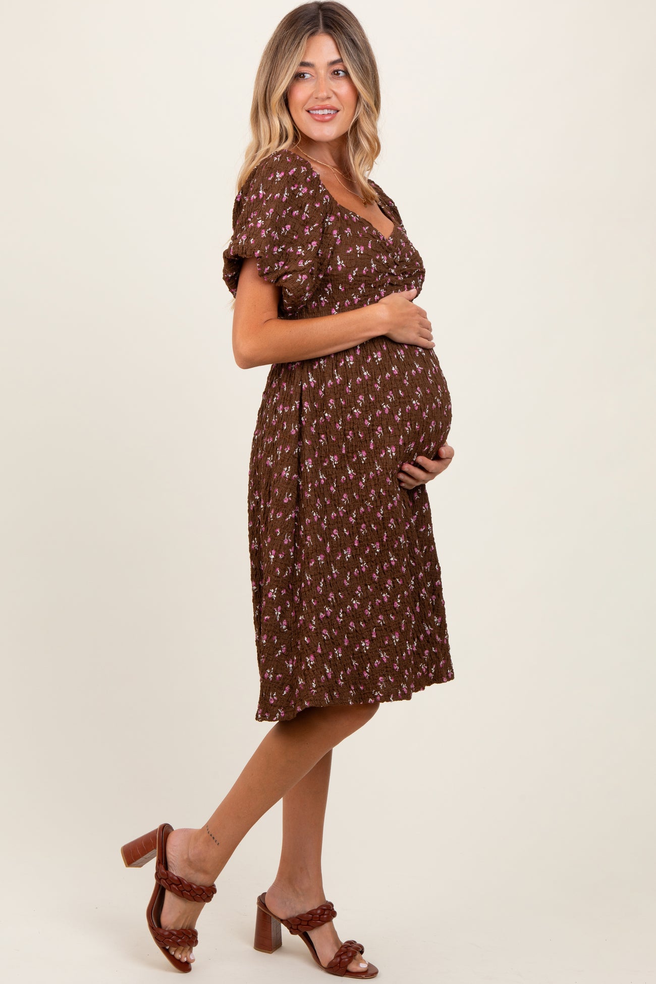 Brown Floral Smocked Sweetheart Maternity Dress