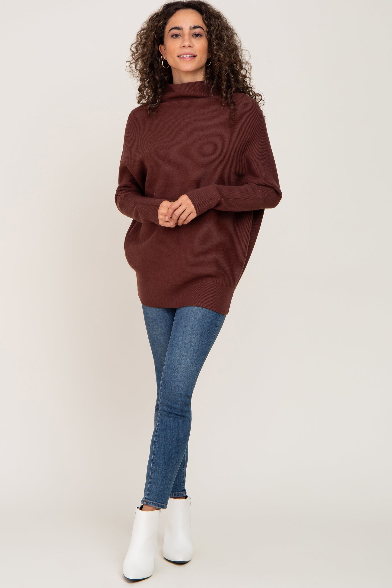 A solid hued sweater featuring a funnel neckline, long dolman sleeves and a fitted bottom hem.