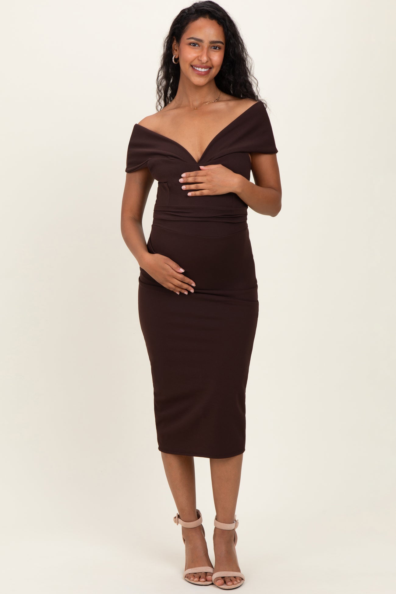 Brown Off Shoulder Fitted Maternity Midi Dress