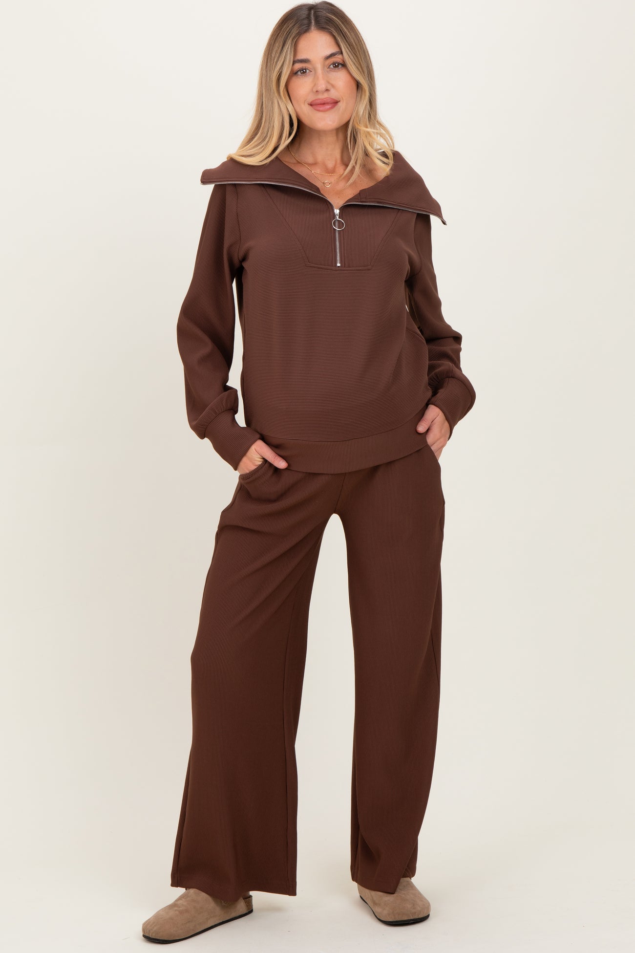 Brown Ribbed Half Zip Pullover Wide Leg Pant Maternity Set