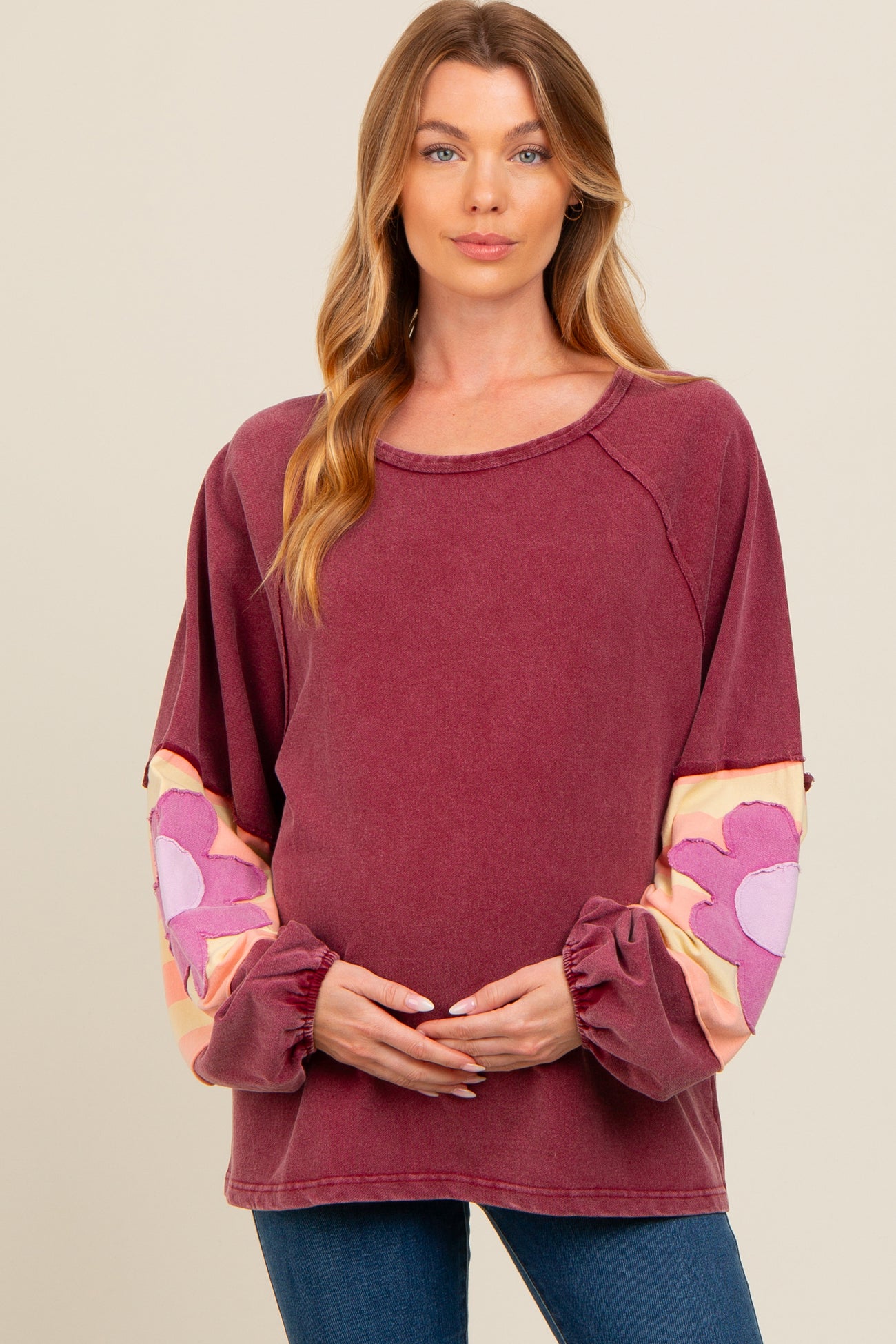 Embrace comfort and style with our Burgundy Raw Edge Flower Patch Maternity Top. Crafted from soft, breathable fabric, this top features a relaxed fit that gently accommodates your growing bump. The unique raw edge detailing adds a trendy touch, while the colorful flower patch appliqués on the sleeves bring a playful, feminine vibe. Elastic cuffs provide a secure yet comfortable fit, perfect for everyday wear or casual outings. Pair this charming top with your favorite maternity jeans for a cozy, chic look throughout your pregnancy. Machine washable for easy care.
