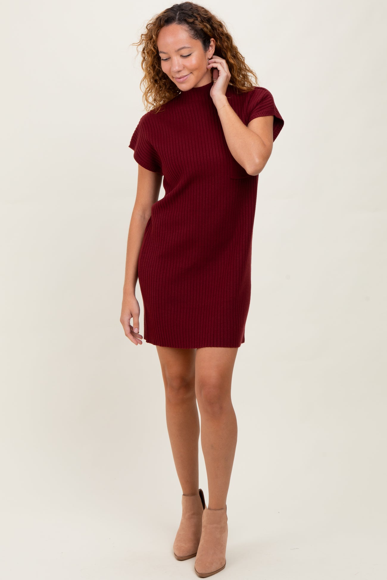 Burgundy Ribbed Knit Short Sleeve Sweater Dress