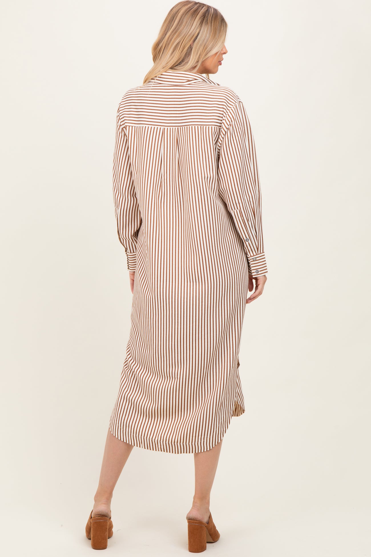 Camel Textured Stripe Button Down Shirt Dress