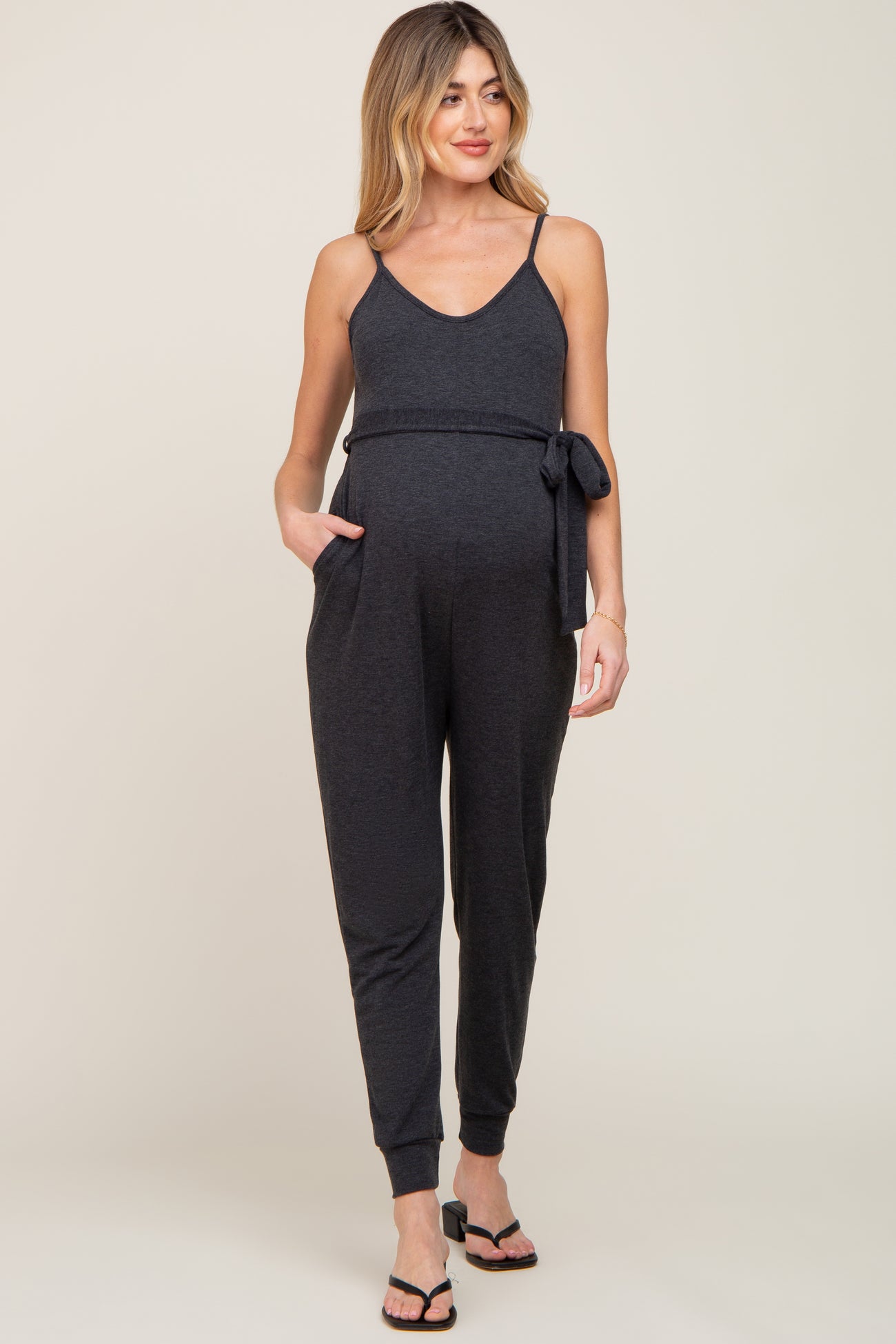 A solid sleeveless maternity jumpsuit with adjustable straps. sash tie waist and tapered fit bottoms. Pocketed.