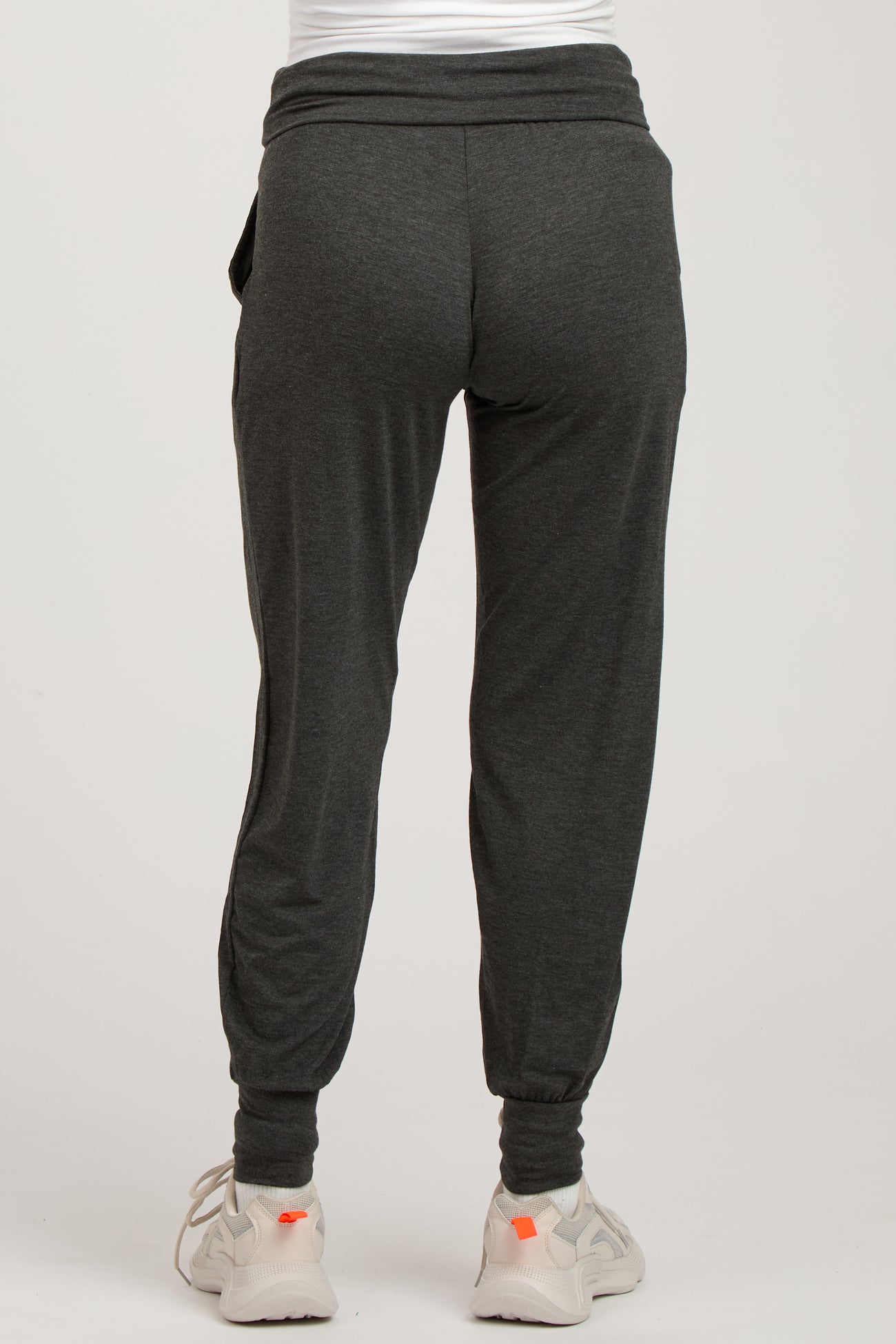 A pair of soft maternity joggers featuring a wide belly band and side pockets.
