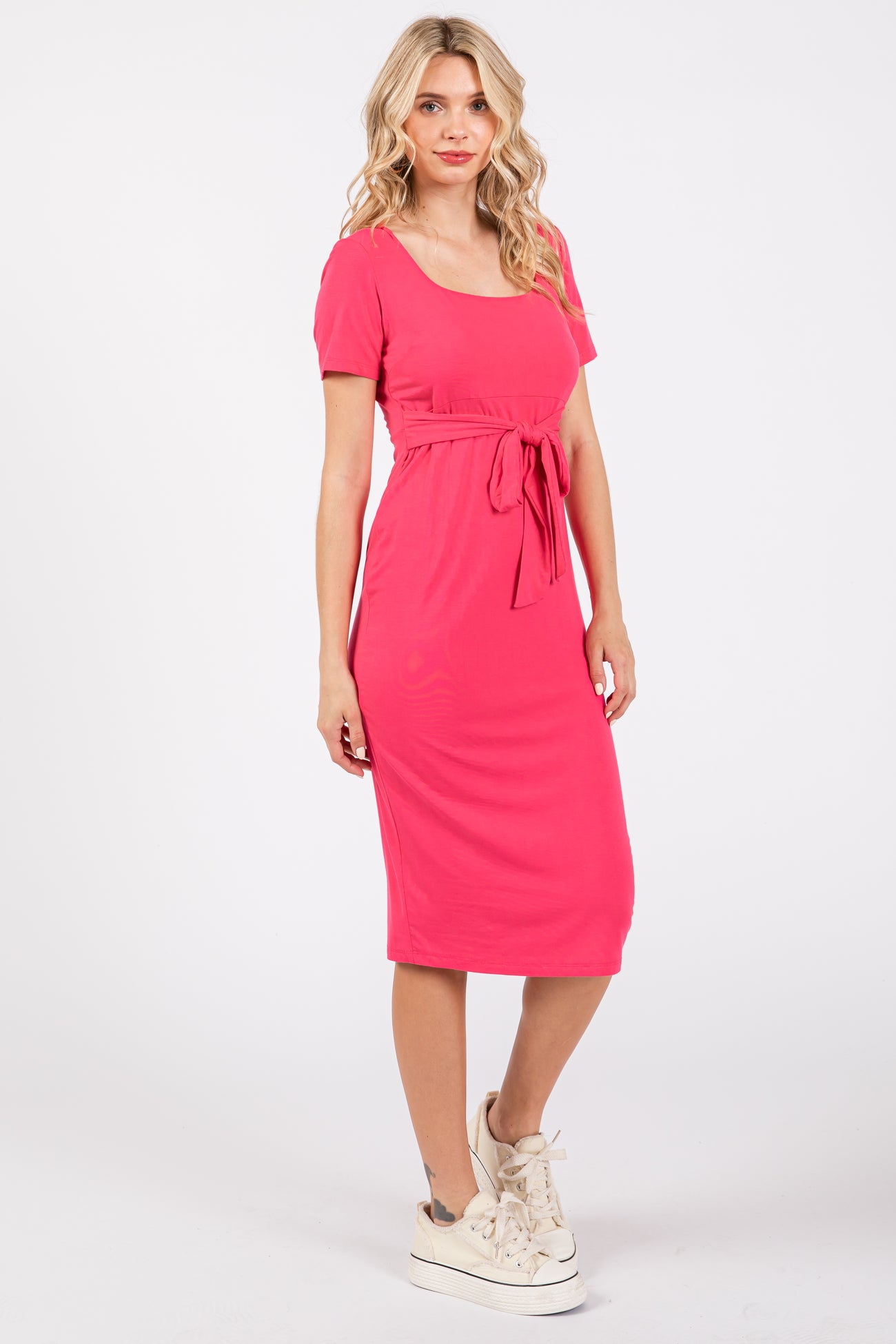 A solid hued midi dress featuring short sleeves, a belted waist and a square neckline.