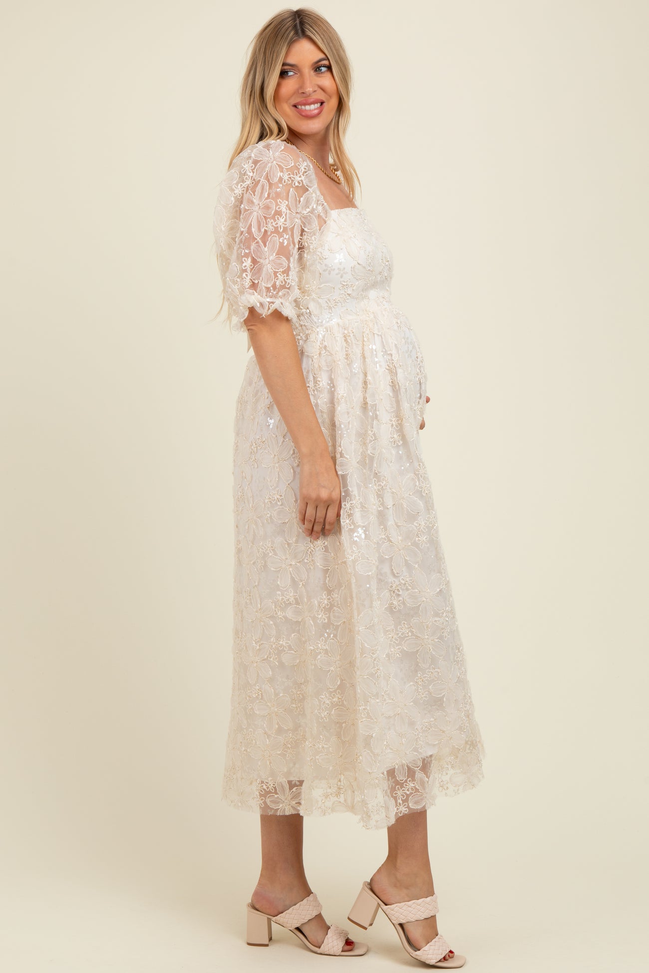Cream Floral Mesh Overlay Tie Back Maternity Midi Dress