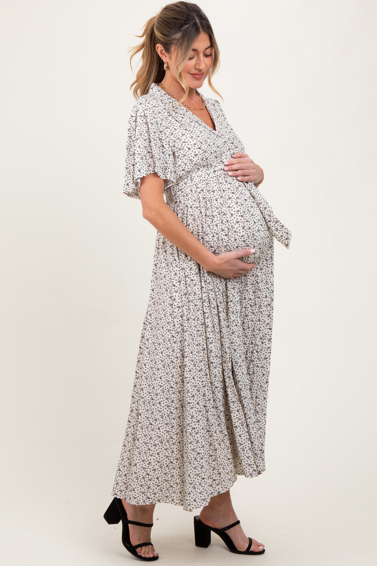 Cream Flutter Sleeve Button Down Maternity Maxi Dress