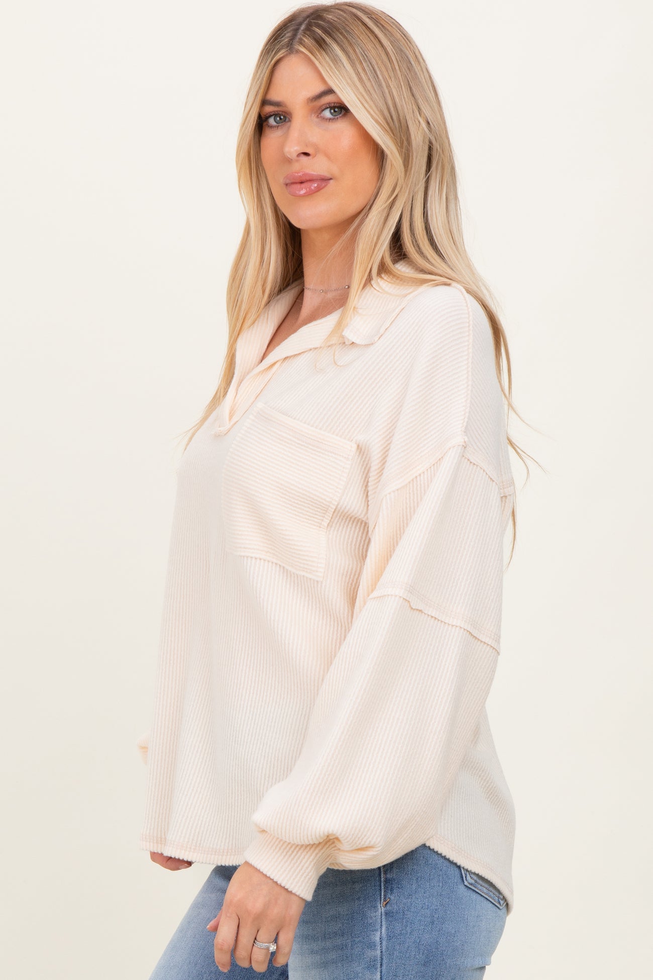 Cream Solid Ribbed Long Sleeve Pocketed Collared V-Neck Top