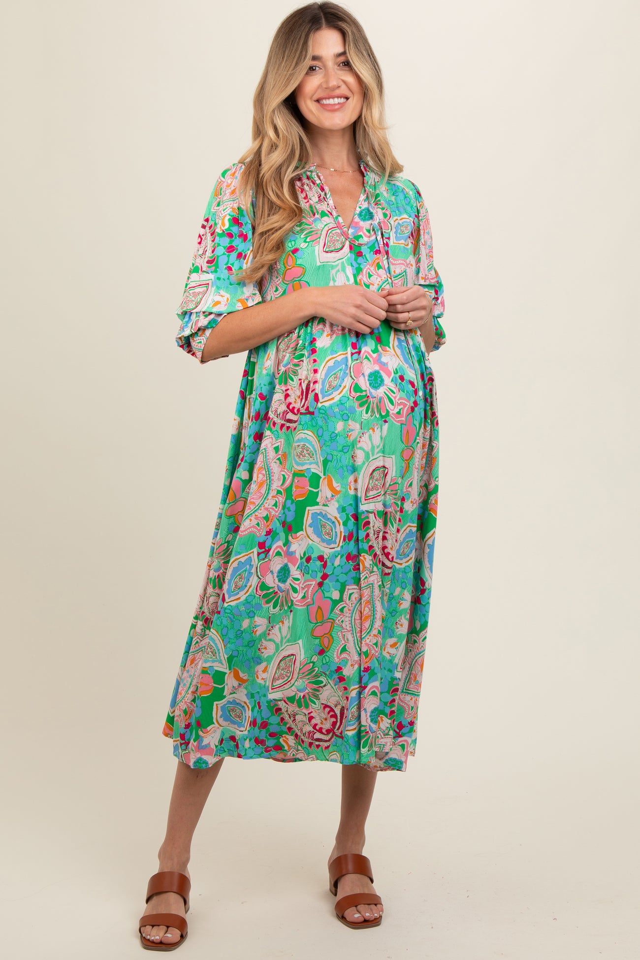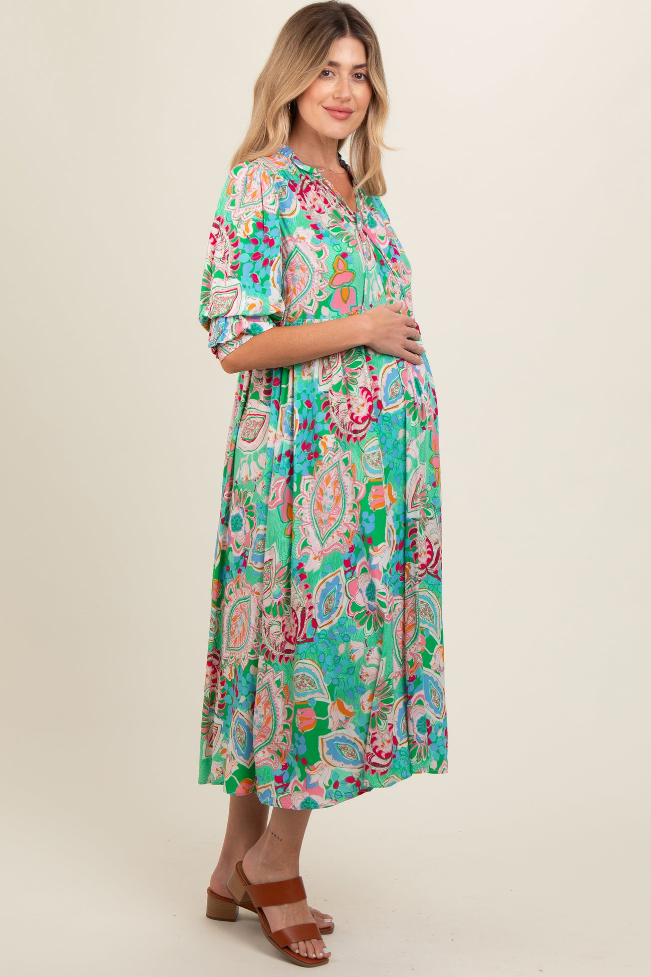 Emerald Paisley Print Tiered A-Line Maternity Midi Dress