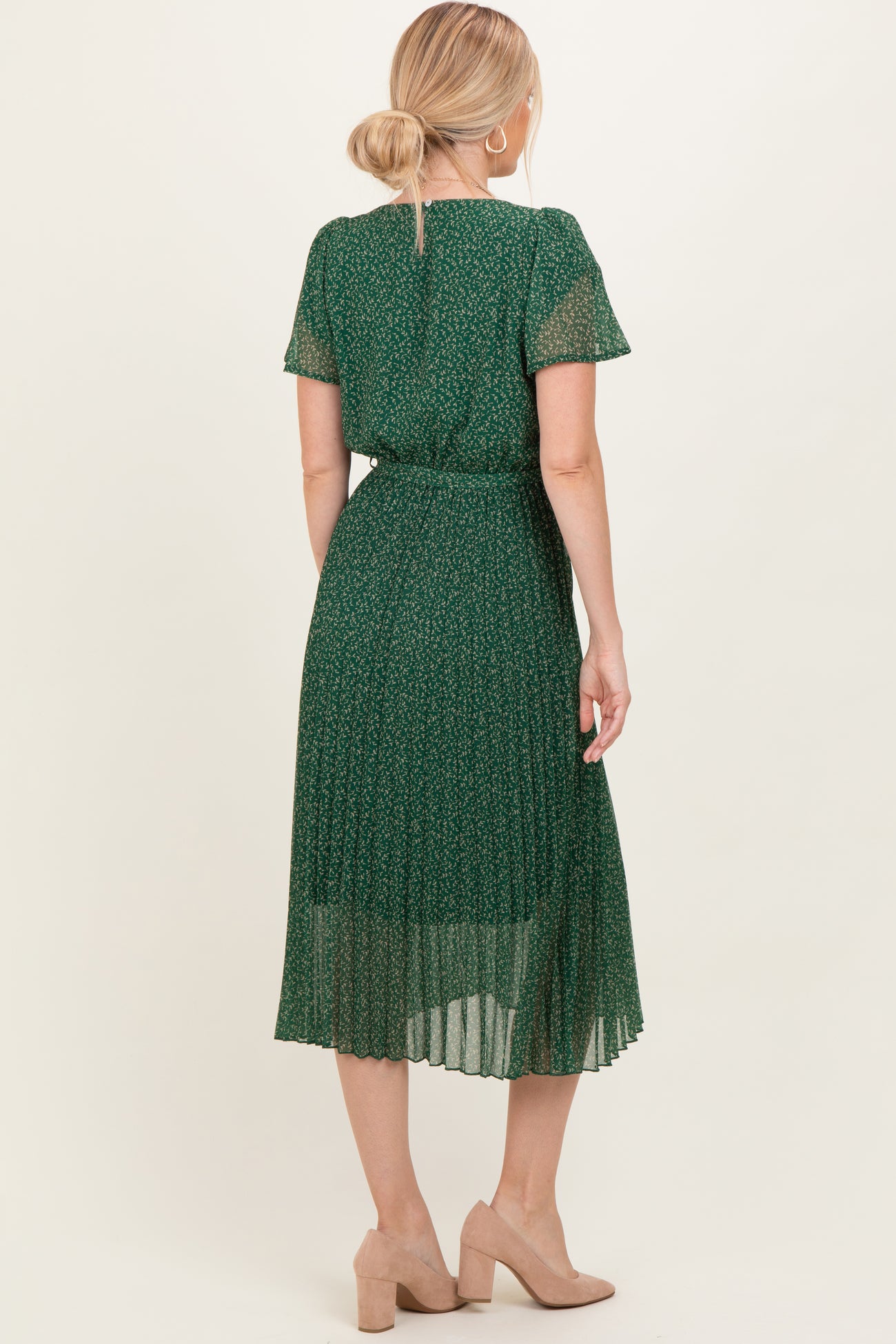 Embrace effortless elegance with our Forest Green Leaf Print Pleated Midi Dress. Featuring a delicate leaf pattern on a rich forest green backdrop, this dress is designed with soft flutter sleeves and a flattering round neckline. The pleated skirt adds graceful movement, while the self-tie waist cinches for a beautifully defined silhouette. Crafted from lightweight, breathable fabric, it offers all-day comfort and style. Perfect for garden parties, casual outings, or a day at the office, this versatile midi dress is a must-have addition to your wardrobe. Pair with nude heels or sandals to complete your look.