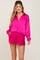 A satin maternity set with a button up and shorts. The button up features a collar, long cuffed sleeves, and a rounded hem. The shorts feature a smocked elastic waist, a front tie, and front pockets.