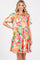 A floral dress with a button front, short puff sleeves, a collar, and a tiered body. Includes a stretch slip dress underneath.