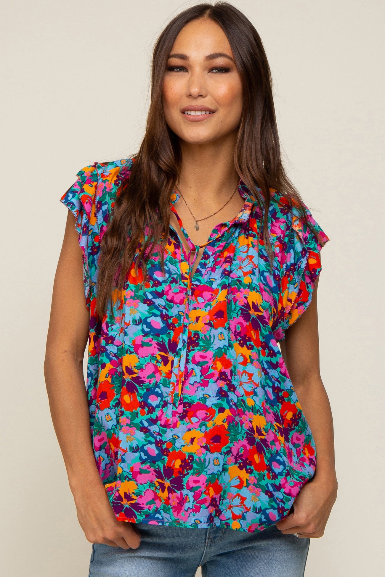 Fuchsia Multi-Color Floral Ruffle Front Tie Maternity Top