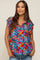 A multi-colored floral print maternity top featuring a v-neckline with ruffle trim and an adjustable tie and short sleeves with ruffle layers.