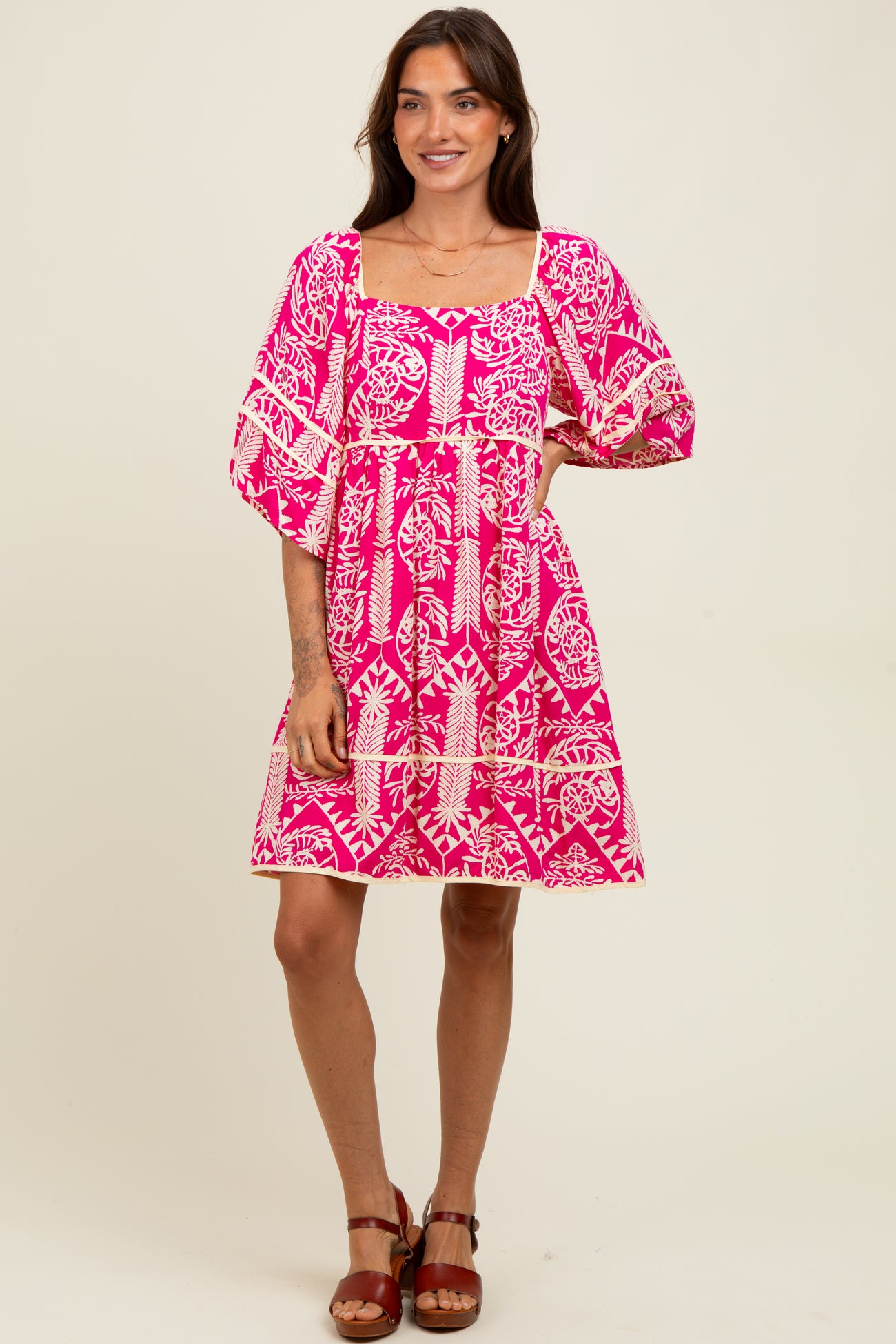 Fuchsia Printed Tie Back Contrast Trim Maternity Dress