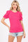 A ribbed top featuring short puff sleeves with a ruffle trim and a rounded neckline.