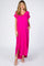 A solid hued maternity dress featuring short sleeves, a round neckline, side pockets, a curved hem and large side slits. This style runs big.