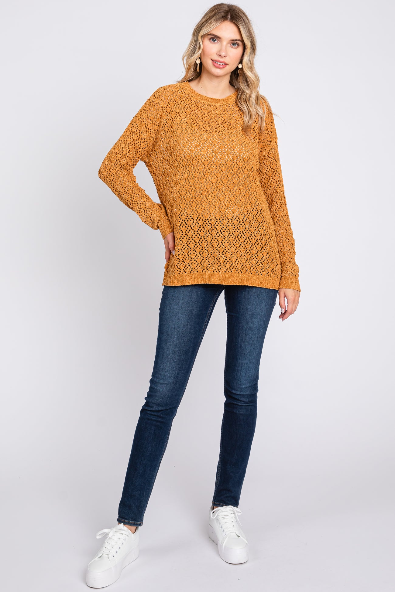 A soft chenille, open knit sweater. Features a ribbed rounded neckline, long sleeves, and a ribbed hem.