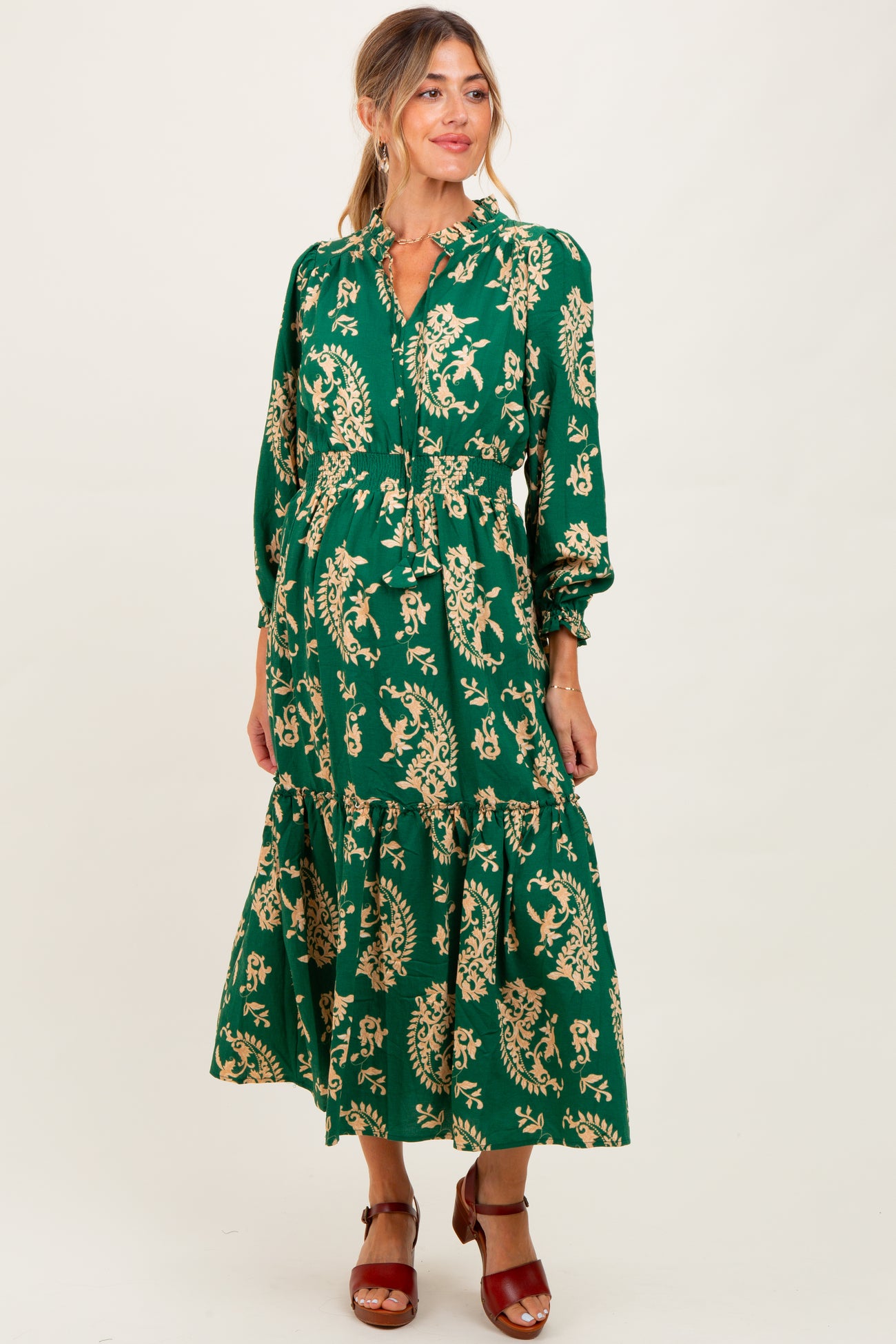 Green Damask Front Tie Smocked Waist Maternity Midi Dress
