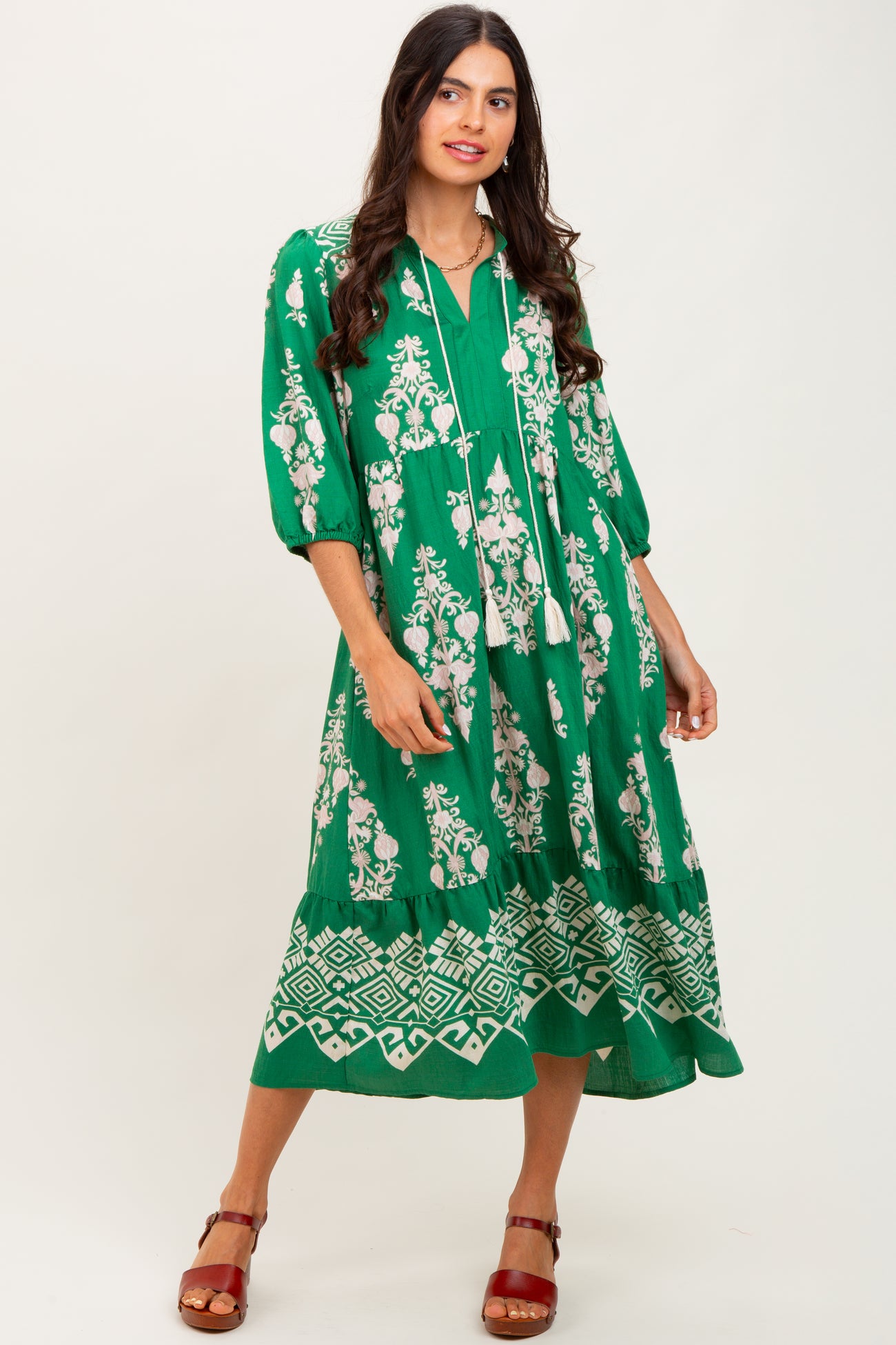 Step into effortless style with our Green Damask Tassel Front Tie Tiered Midi Dress. This vibrant midi dress features an intricate white damask print that adds a touch of elegance to your everyday look. The front tie with delicate tassels offers adjustable comfort and a flattering neckline, while the tiered skirt creates a flowy, feminine silhouette. Crafted with 3/4 puff sleeves and a comfortable fit, this dress is perfect for both casual outings and special occasions. Pair it with sandals or wedges for a chic, boho-inspired vibe. Embrace comfort and style in every step!
