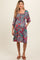 A floral maternity knee-length dress with a squared neckline, half-length sleeves, a smocked top, and side pockets.