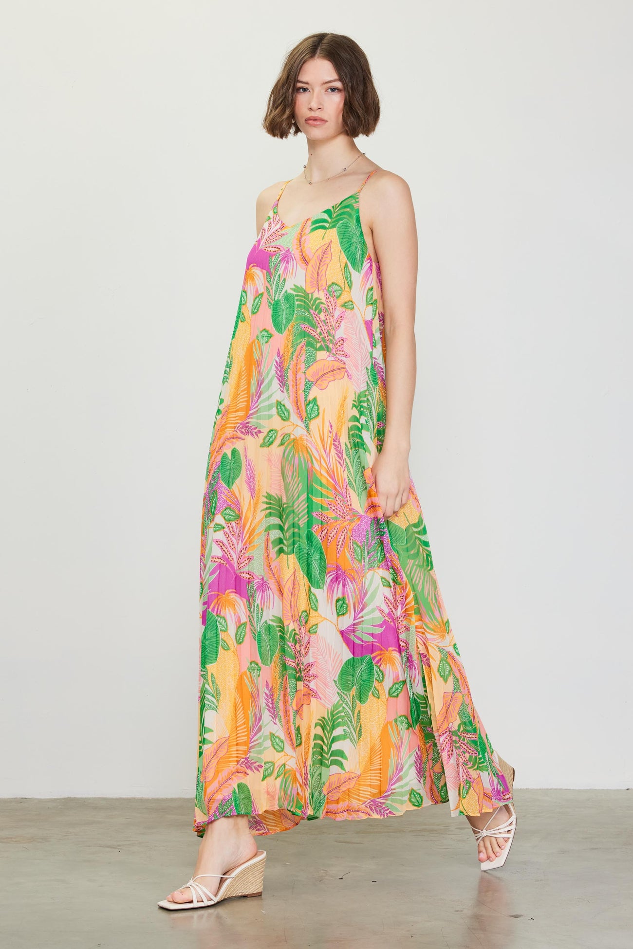 A leaf print pleated maxi dress with a v-neckline and adjustable straps. Dress is fully lined.