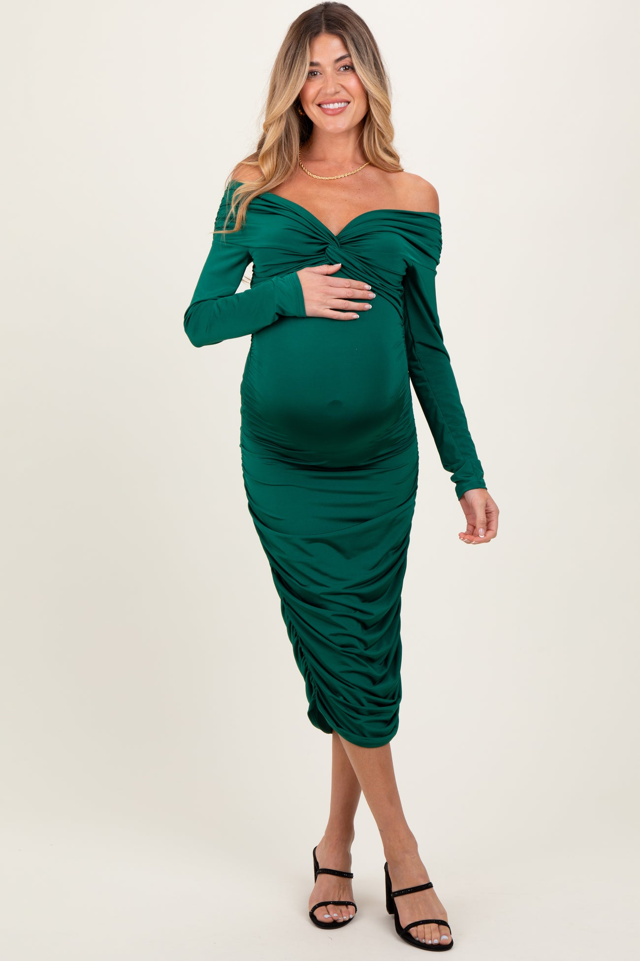 Green Off Shoulder Ruched Long Sleeve Maternity Midi Dress