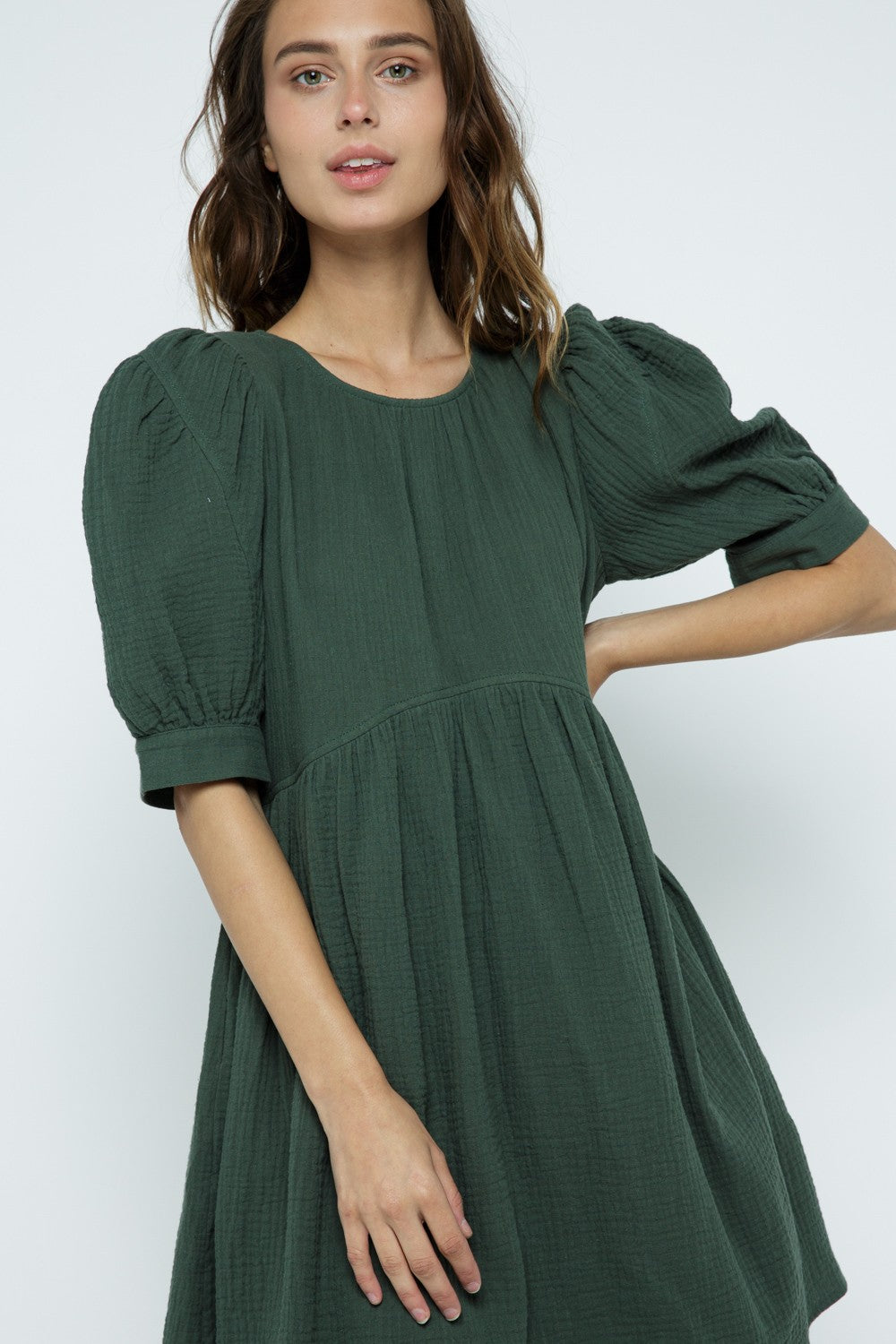 Green Puff Elbow Sleeve Flare Baby Doll Dress