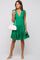 A satin dress featuring a v-neckline with ruffle trim, a tiered skirt, a zipper back and double lining.