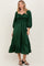 Elevate your style with our Green Satin Smocked Cinched Bust Midi Dress. Crafted from smooth satin, this midi dress features a flattering smocked bodice with a cinched bust detail that enhances your silhouette. Its elegant green hue complements any skin tone, while the long puff sleeves with elastic cuffs add a romantic, vintage-inspired touch. The flowy, tiered skirt falls gracefully to mid-calf, making it perfect for both day and evening occasions. Pair it with heels or sandals for effortless sophistication. Comfortable, stylish, and effortlessly chic—this dress is a must-have addition to your wardrobe.