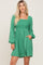 A solid hue dress with a squared neckline, long cinched sleeves, a smocked bodice, and side pockets.
