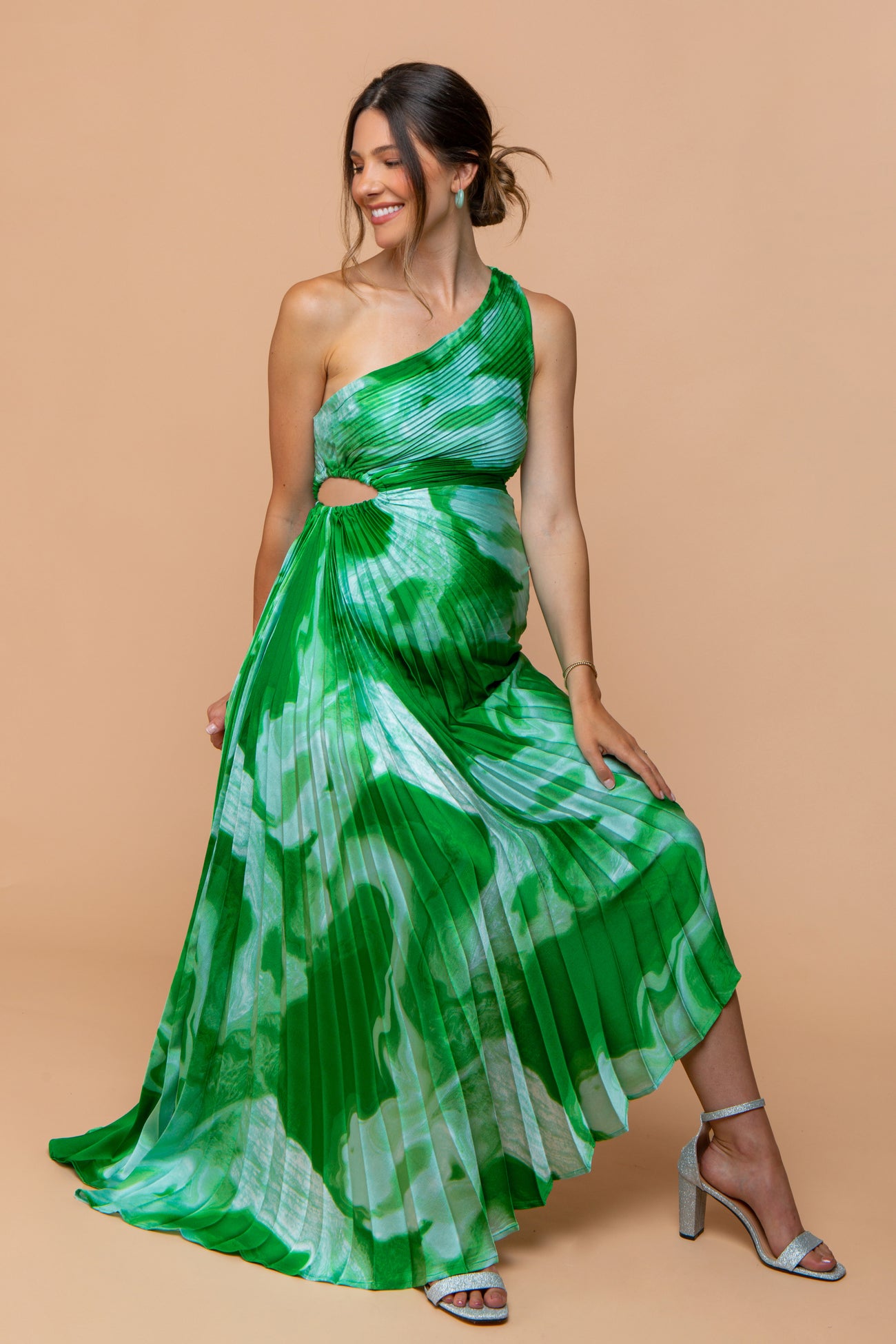 Green Watercolor Satin Pleated One-Shoulder Asymmetrical Maternity Midi Dress